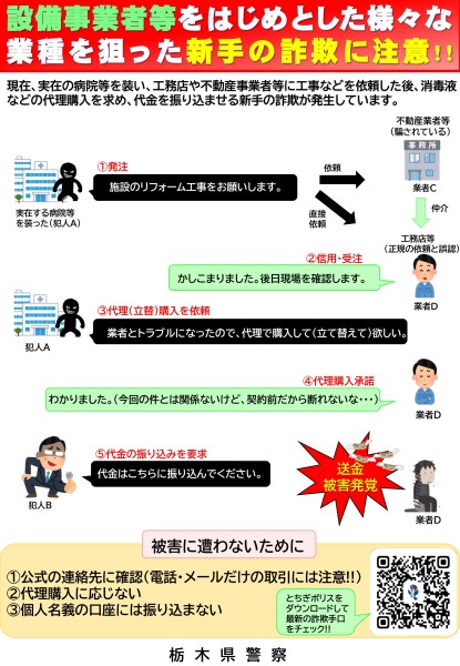 栃木県警生活安全企画課より「設備事業者等をはじめとした様々な業種を狙った新手の詐欺」について、